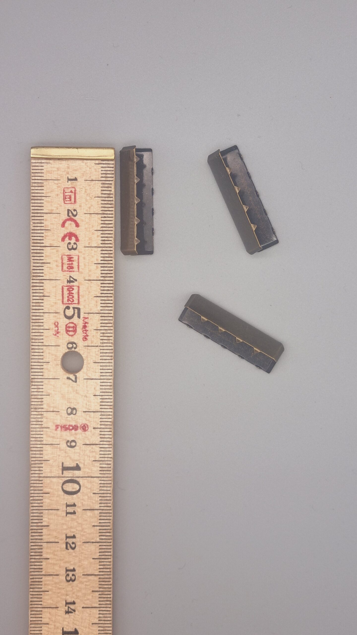 Toothed metal end clip to finish edges on cotton webbing, canvas, vinyl and/ or leather used for belt ends, bag straps, wallet straps, key fobs, key rings, etc…